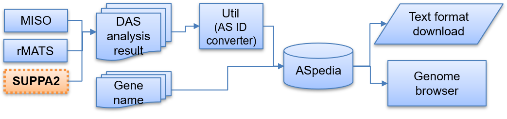 The previous version provided multi-omics profiles on splicing regions for reference genome hg18 and 19. The retrieval system allowed the search from multiple AS event IDs to annotate AS events. Multiple AS events of differential AS analysis (MISO and rMATS) could be annotated using our system.