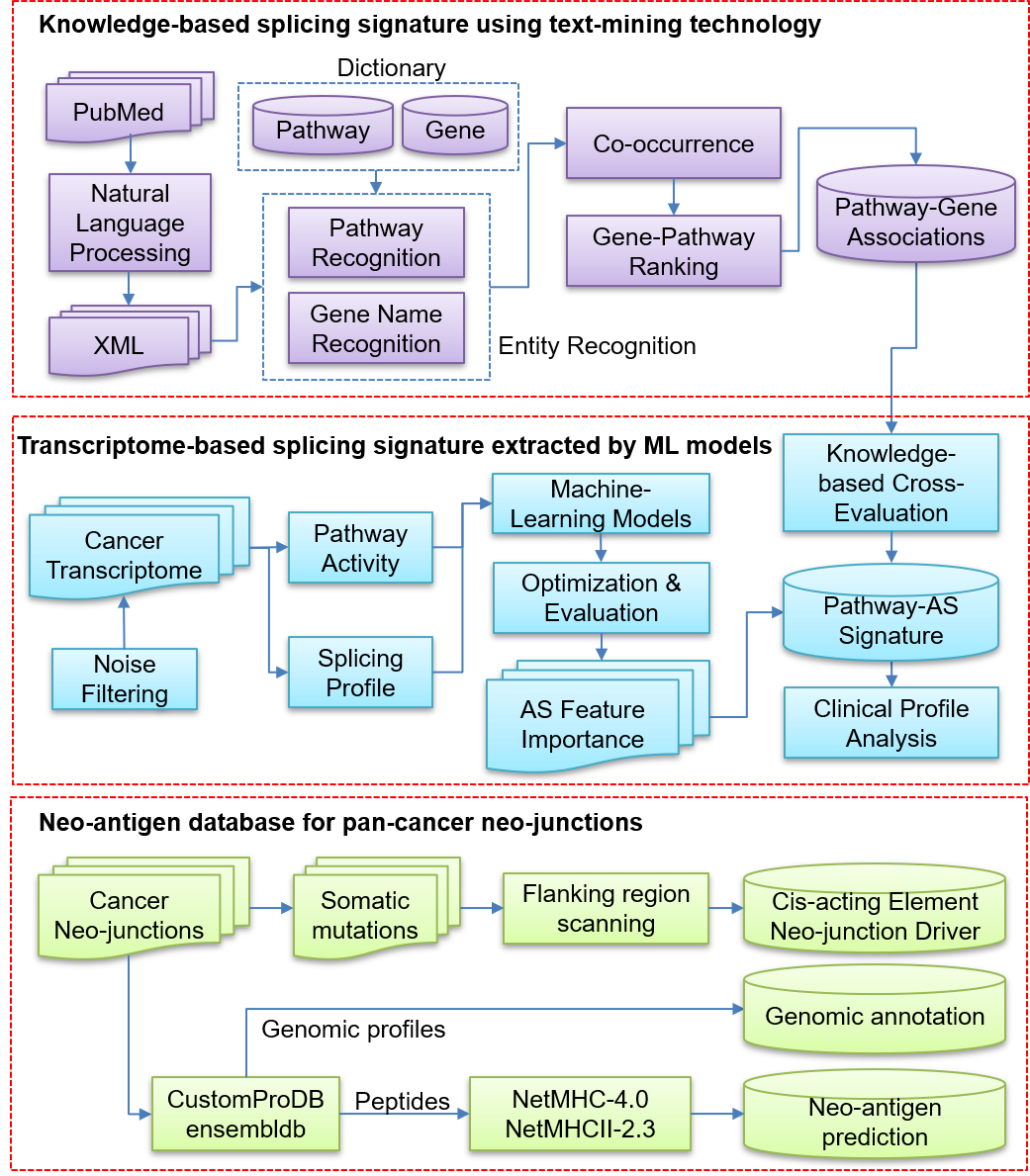 We introduce new contents of knowledge- and transcriptome-based splicing signatures and cancer neo-junctions. (1) Knowledge-based splicing signatures were extracted from literature using text-mining technology. Each signature set was collected, showing co-occurrence with the pathway term. The importance of pathway-gene pairs was ranked by multiple co-occurrence tests. (2) Transcriptome-based splicing signatures were extracted from pan-cancer transcriptome profiles using machine-learning technology. Especially, transcriptome-based signatures passed cross-evaluation from knowledge-based signatures and considered AS event recurrence detected across cancer types. (3) Cancer neo-junctions derived from variants on cis-acting elements play a critical role as a neo-antigen to bind with major histocompatibility complex (MHC). We acquired neo-junction coordinates from a previous study of the pan-cancer transcriptome [PMID: 30078747]. Genomic profiles of neo-junctions were annotated, encompassing gene name, ID, and protein-coding frame. The binding affinities between MHC class I/II and translated peptides for each neo-junction were predicted. It could be useful to explore the functionally important neo-junctions for cancer cells.